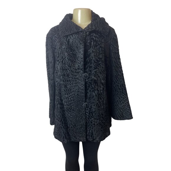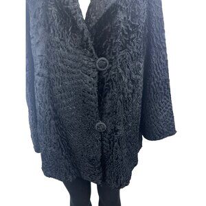 Elegant and warm, this vintage black coat features a unique Persian lamb texture, satin lining, and oversized buttons for timeless sophistication.