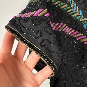 Pair this vintage beaded silk Marshall Fields blouse with a black mini skirt & heels for a chic timeless look.