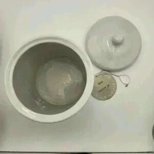 This jar with its simple winter scene is NWT but it does have a hairline crack along the bottom lip (see photos). The crack does not extend to the inside so it will not affect use.
