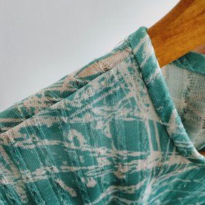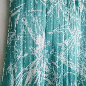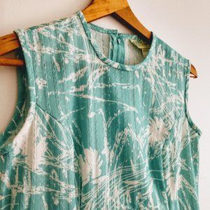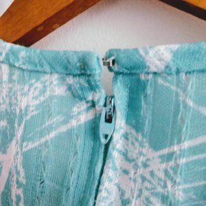 Vintage (1960s-70s) Marti Petite sheath dress. Beautiful aqua blue and white abstract palm/floral print. Incredibly lightweight, slightly transparent. Zip closure. Missing original belt; but has belt loops at natural waist. One small stain top of right shoulder (see photo).