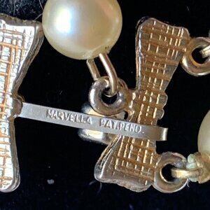 An elegant double-strand choker style necklace featuring faux pearls, crystal beads, and a charming bow hook clasp. Signed "Marvella Pat. Pend." on back of the clasp, dating this piece to the 1950's/60's when Marvella's bow clasp was still awaiting patent approval. This necklace features creamy iridescent white faux pearls of different sizes alternating with gold filagree spacers and clear faux crystal faceted beads with gold accents. There is a 2" extender for the perfect fit. The beautiful bow clasp in back makes this necklace attractive from any angle. This necklace is in beautiful condition and offers sophistication and timeless style. See photos for more details.