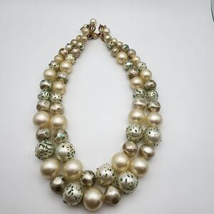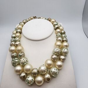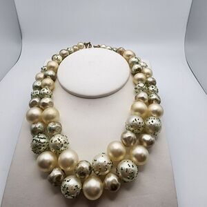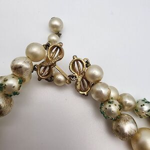 Vintage Marvella faux pearl two-layer collar necklace with a variety of shapes of faux pearls and green bumpy dogs on some of them.