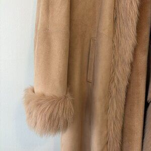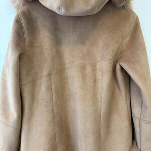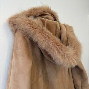 Light brown very soft faux suede long jacket with faux fur trim. Has a zip off hood. Super soft sherpa lining. Has hook and eye closures