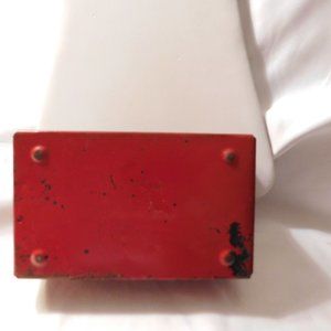 There is no key. Made of metal. Shows wear/scratches and patina (please see pictures). Can be re-painted or left as is for the vintage look.