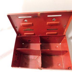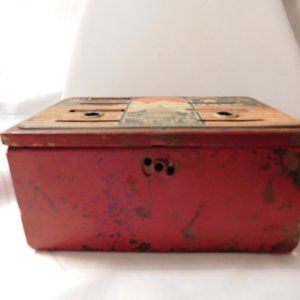 The left side says bank and one slot on top reads doctor and right below that baby. To the top left, the word budget can still be slight seen but the other 2 categories cannot. Features 4 small square slots when opened. Can also be used to store small craft materials, nails/hardware, etc..