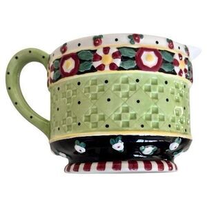 • The creamer is approximately 3.25″ in height and 3½″ in diameter, painted in soft green hues with tiny black dots and bordered with peppermint motifs.