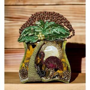 This Vintage Mary Frances Top Lift Flamingo Flamingo bag from the early 90’s is simply stunning! Featuring a Flamingo, palm tree and alligator relief design on plaster with hand beading, with a top that lifts off and is attached to the top and bag. This style of bag was one of the first designed by Mary Frances and is truly a piece of art, you will not find another bag like this one, it is very special!