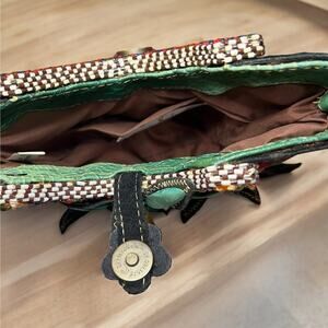 This Vintage Mary Frances Beaded Floral Bucket Bag from the mid 2000’s is giving off major boho vibes and is so cute! This bucket shaped bag is covered in jade green snake print leather with sections of burgundy and gold cotton fabric, embellished with hand beaded trim, three dimensional large flowers with jade green soapstone leaves, fringe accents, black suede bottom and brown leather and suede trim and strap. If you love the Boho chic, festival look, this one-of-a-kind bag is perfect for you!