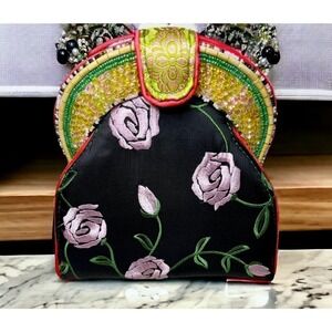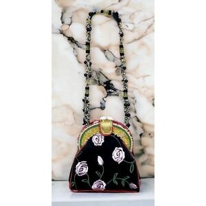 This Vintage Mary Frances Friendship Rose bag from 2005, is a work of art! A unique Mary Frances bag featuring a black background with embroidered roses, brocade trim, hand beaded details/strap and mother of pearl flowers. Mary Frances bags are known for their whimsical themes, elegance, hand crafted details and quality. This stunning vintage bag is just as stylish today as it was 20 years ago. If you love or collect Mary Frances, then this is a must have for your collection!
