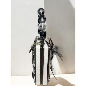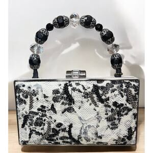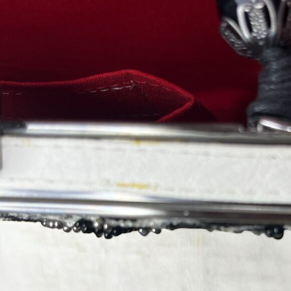 Exterior – Leather covered hard case, hand beading, feather detail, platinum hardware, Mary Frances emblem, beaded structured hand strap and top push lock closure.