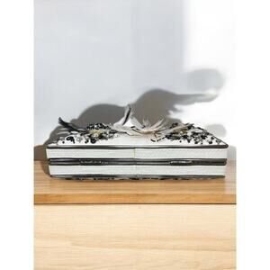 This Vintage Mary Frances Hand Beaded Feather Retired Handbag from the early 2000’s is just gorgeous! Featuring a structured case design covered in snake skin embossed leather, with a floral motif in crystals, hand beading and feathers. This bag is a piece of art, is giving off 1920’s vibes and would be perfect for a special event!