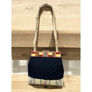This Vintage Mary Frances Western Equestrian Bag from the late 90’s is such a special bag! Featuring a padded frame covered in black cross hatch fabric with a hand beaded horse, leather saddle and stirrups, stone and beading trim and a cream and floral striped bottom, this bag is a very rare find and just exquisite. If you love and appreciate hand crafted, vintage, unique bags or the Equestrian Western theme, this bag is perfect for you!