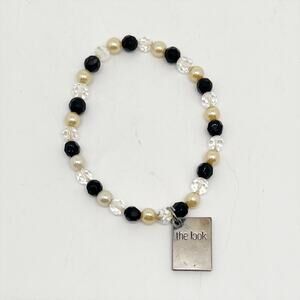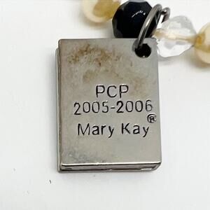 Black and clear beads with faux pearls. Elastic stretch band. Silver tone charm. "the look" on one size. "PCP 2005-2006 Mary Kay" on the other. The charm has turned some. See photos.