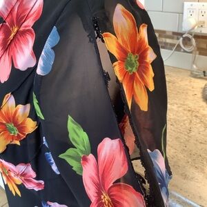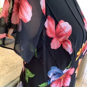 This stunning sundress by Mary McFadden features a Hawaiian design in a chic black and pink color palette. With its flutter short sleeves and v-neckline, this maxi dress is perfect for a wedding guest or a night out. The flowing silhouette and airy fabric ensure a graceful and comfortable fit.