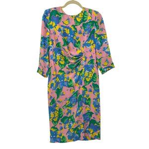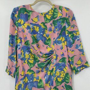 Dainty Pink and pastels floral print on a wood grain embossed pattern. Has a ruched waist on one side and shoulder pads. Such an amazing dress in excellent condition!