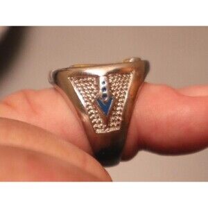 Beautiful vintage mens or boys Masonic ring featuring the Mason emblem in blue and gold with rhinestone at top of the compass. Silver tone metal -- not sterling, and not marked.