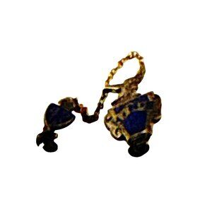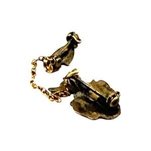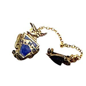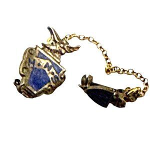 Authentic vintage Masonic collar pins featuring classic Blue Lodge symbols connected by gold-tone chains. This collectible set of two includes a detailed trowel and keystone emblem, likely from a Freemason ceremonial uniform. Ideal for collectors or Masonic regalia enthusiasts, these pins showcase intricate enamel detailing and historical craftsmanship.