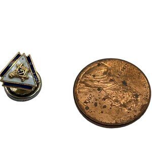 This vintage Masonic lapel pin features a distinctive triangle design with gold, blue, and white enamel. Ideal for collectors and Masonic enthusiasts.