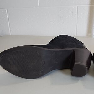 These black heeled boots boast a chunky, medium-height heel and a snug fit around the ankle. Crafted from a soft, textured material, they offer a sleek and modern look. The V-shaped opening at the top adds a touch of elegance to their design.