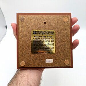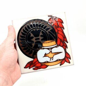 Very nice handmade art tile. True vintage. Made from redware / terra cotta clay with a cork backing and very nicely done glaze. This tiles measures 6 inches square and features a southwestern / Mexican Tonala pottery vase piece and a string of dried chilis. SO cool for Southwestern or desert decor.