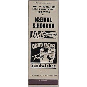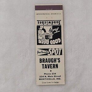 Vintage Matchbook Cover Braugh’s Tavern Monticello IN Indiana White