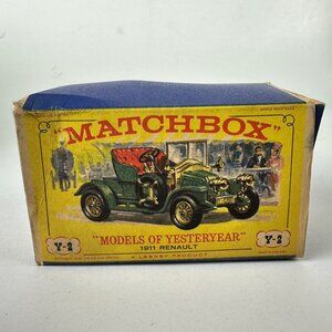 Collectible Matchbox diecast car featuring the 1911 Renault Y-2 model. Includes original box with vintage artwork. Ideal for collectors and enthusiasts.