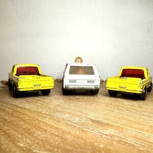 Lot of 3 vintage Matchbox Rolamatics die cast trucks including 2 pickup trucks and a police SUV. Made in England by Lesley. Vehicles are in various conditions (See photos for details)