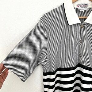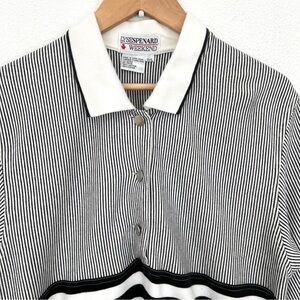 Size Large Black and white striped striped stripes Short sleeve top shirt Collar with half placket buttons High rise bottom with button pockets Drawstring elastic waist Soft cozy stretch fabric 100% cotton Made in Hong Kong Good vintage preowned condition, some discolorations at back bottom cuff of pants Approx measurements of flat lay: Top: Chest: 20” Length shoulder to hem: 26.5” Pants: Waist: 14.5” Rise: 16.75” Inseam: 27” Preppy Sailor Cozy Elevated Casual Loungewear Relaxed Vintage