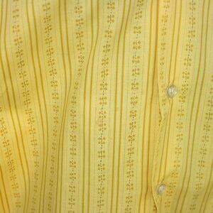 This is a vintage Matt Andrews button-up shirt. It is marked as 65% Cotton, 35% Polyester, and Made in Hong Kong. It is marked as size XL and is about 32" long and 24" pit to pit. There are some dark "spot" stains on the right front by the seam. They blend in with the pattern somewhat. Otherwise it's in great shape.