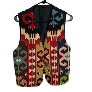 This listing is for a Matt Camron Mens Handwoven Vest. Multicolor. Single concho closure at the front. Wool/Acetate/Polyester. USA Made.