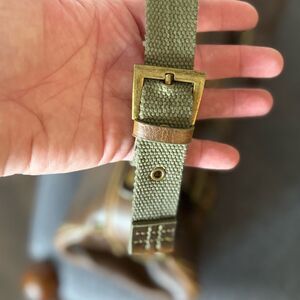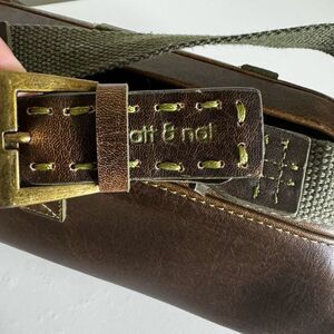 vintage y2k Matt + Nat army green & brown vegan leather doctor duffle bag purse, contrast stitching, army green canvas strap and details, approximately 13” x 5”, this bag is in excellent pre-owned condition with a clean interior