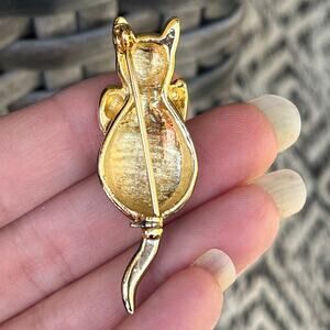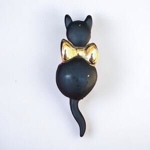 Vintage Matte Black Enamel Cat With Gold Tone Bow Pin Brooch