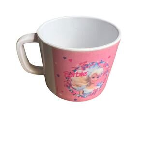 The product is a vintage Mattel Barbie Ballerina pink cup/mug designed by Zak Designs in the 90's. This collectible piece features a Barbie Ballerina style, perfect for those who appreciate nostalgic and retro items. The cup/mug holds a unique charm for collectors of vintage Barbie memorabilia. For cold drinks only.