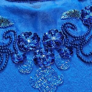 Elegant blue sweater with intricate sequin and bead embellishments, lining a sheer mesh panel at the collar.