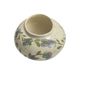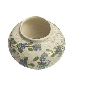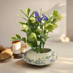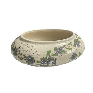 The low, oval organic wabi sabi shape is perfect for forcing bulbs, but this piece could be used as a planter or as a vase. Maurice of California produced ceramics such as this in the 50's in the Los Angeles area. On the bottom, it is marked, "Maurice 6058." The white gloss glaze has some crazing and glaze pops, but the planter is in overall good vintage condition with no chips or cracks. Handpainted wisteria vines all away around. Beautifully wonky!