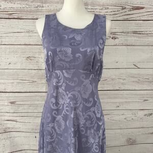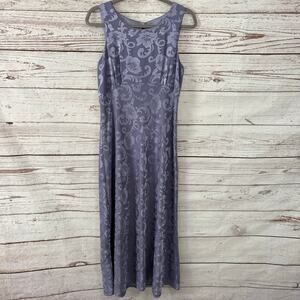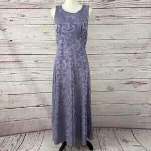 Vintage Maurices Women's Blue Purple Brocade Cut Out Back Midi Maxi Dress Size 9/10. 100%Polyester. Approx. measurements pit to pit 16 in. Waist 30 in. Dress length 52 in. dot stain and light discoloration inner lining, does not show on the outside. Pre-owned in good condition, o holes.