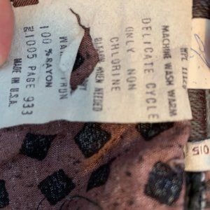 Vintage midi skirt with a mauve ground and black abstract geo print for an 80's vibe. Features a side button closure, slight pleating at the waist, and pockets.