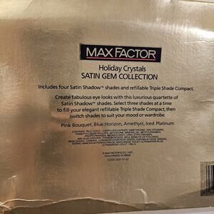 This Max Factor holiday crystals, satin gem collection. Includes four Satin shadows. And a refillable triple shade compact. Pink bouquet, blue horizon, amethyst, and iced platinum. From an estate in St Petersburg florida. New in box. Some shelf wear to the boxes. Compact and makeup in excellent condition. This was a holiday gift with purchase set. Ask me any questions. I want you to love your purchase.
