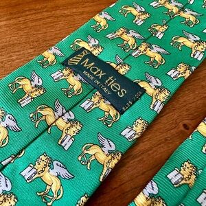 Vintage Italian silk tie from Max Ties featuring a unique green background with winged lions holding open books — a symbolic nod to the Lion of St. Mark. A high-end novelty print in excellent condition.