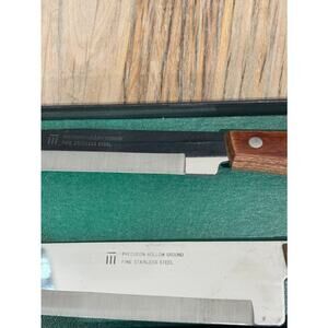 Classic Maxam 2-piece carving knife set featuring precision hollow-ground stainless steel blades and wood handles with triple rivets, housed in the original green presentation box. These vintage knives offer a timeless blend of durability and craftsmanship — perfect for display, collection, or everyday use in the kitchen.