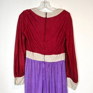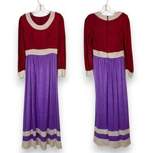 Vintage Chas Lewis Hollywood California Maxi Dress 60s 7's Woodstock Prairie Purple Red Long Sleeve Color Block retro