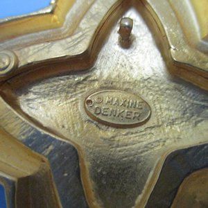 Vintage Maxine Denker Modernist Designer Brushed Golden Pendant. Substantial Art Deco 4 point design has smooth rounded edges. Measures 2-5/8 inches from point to point. Large 3/4" loop for chain or necklace. Good vintage condition. MAXINE DENKER signature plate in back. Wear and aging consistent for vintage pre-owned item. All measurements are approximate. J0715