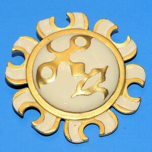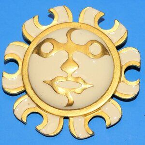 This listing is for a beautiful Vintage Maxine Denker Sun Face Brooch Pin Enamel Gold Tone Modernist Signed Rare.