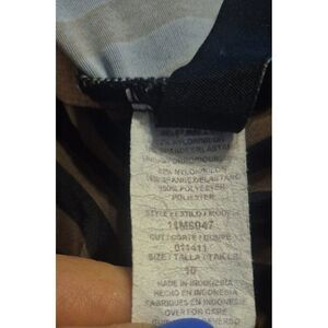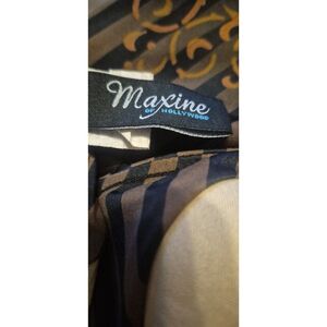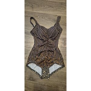 This is a vintage Maxine of Hollywood women's one-piece swimsuit in size 10. The swimsuit features a shirred front design in black and brown colors. The brand Maxine of Hollywood is known for its classic and timeless swimwear styles, making this piece a stylish and elegant choice for a day at the beach or by the pool.