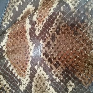 The textural interest of reptile scales give the simple shape of this handbag a decisive edge. While entirely leather, the feel and appearance is decidedly reptilian. Leather is very soft, lightweight and pliable. Black faille interior provides a large center zippered compartment with one side having a smaller zippered pocket and the other two open pockets. A magnetic closure secures the bag at the top. Excellent pre-loved condition inside and out ~ Worn infrequently. Maxx New York. Vintage.