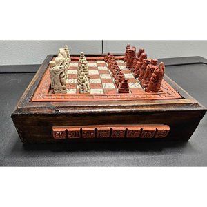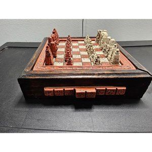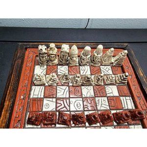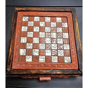 Vintage Mayan Aztec 7" Board Stone Wood Chess Set Handmade Red Drawer