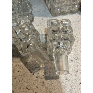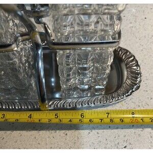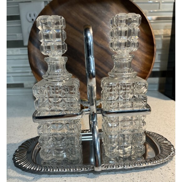 This is a vintage Mayell cruet set that includes three pieces made of fused glass with a square shape and clear color. The set is an original and comes with a chromium plate. It is a rare find and perfect for decorative use in the kitchen or dining room.