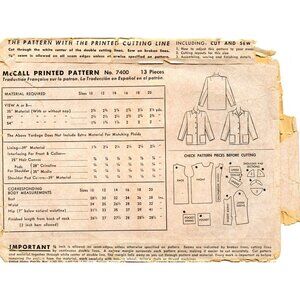 Vintage McCall Printed Pattern 7400 Womens Jacket Sewing Pattern 1940's Size 14