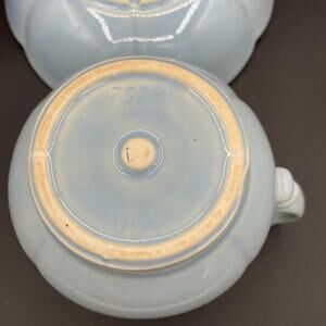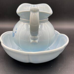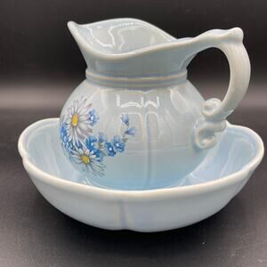 Add a touch of vintage charm to your home with this beautiful McCoy Pottery pitcher and basin set! Featuring a delightful blue daisy design, this set is a wonderful example of classic American pottery. The set is marked #7528 on the bottom.