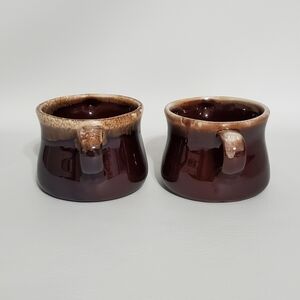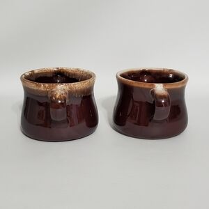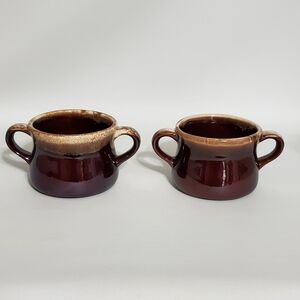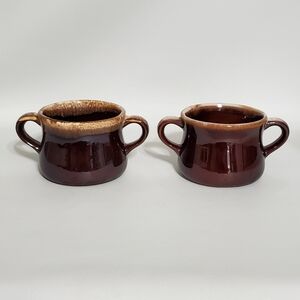 Vintage McCoy brown and tan drip glaze pottery soup bowl with double handles, set of two. These cups are stamped McCoy USA on the bottom of each.